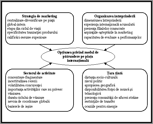 Analizandu-se specificul strategiei de marketing, posibilitatile intreprinderii, caracteristicile sectorului de activitate si particularitatile pietei tinta, rezulta un model care sugereaza optiunea privind modul de abordare a pietei externe, prezentat in cadrul mai jos: