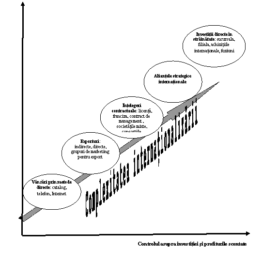 Dupa cum se observa, efortul alocat de intreprindere si intensitatea riscului perceput sunt mai scazute in situatia utilizarii unor strategii de intrare precum sunt vanzarile prin metode directe sau a formelor de export indirect sau direct, dar profitul care se spera sa fie obtinut de pe pietele externe vizate este mai ridicat si gradul de control a intreprinderii straine asupra afacerii este mai mare numai daca sunt utilizate strategii care implica eforturi financiare, organizatorice precum si experienta si, in acelasi timp, care implica un nivel al riscului mai ridicat. Aceste strategii sunt reprezentate de deschiderea unor societati mixte, sau crearea de aliante strategice in strainatate si investitii directe realizate de intreprindere in strainatate.