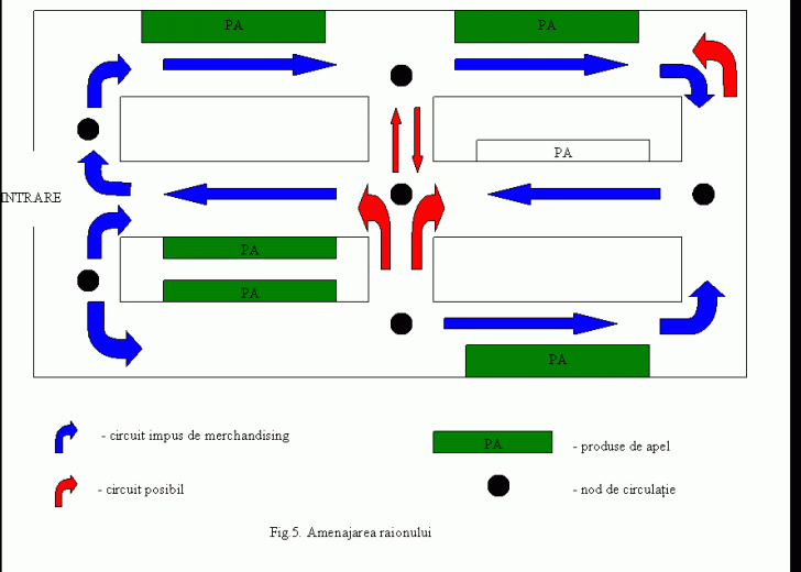Prima regula: trebuie sa se creeze o circulatie coerenta in magazine, avand un sens bine determinat, astfel incat linearul 'vazut' sa se apropie cat mai mult posibil de linearul parcurs. Acest lucru este simplu de realizat in cazul suprafetelor mici. Problema se complica atunci cand trebuie dispuse mai multe gondole. Astfel, intre doua gondole se creeaza in mod natural un nod de circulatie, clientul avand posibilitatea sa abordeze mai multe circuite. El trebuie tentat deci de circuitul general: la acesta se ajunge prin dispunerea de la gondola la gondola a unor produse de apel(fig.5.).