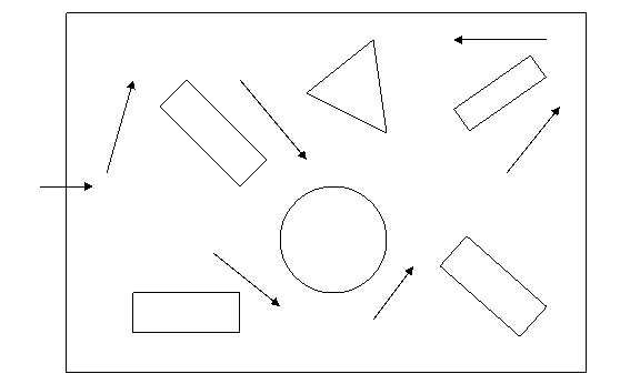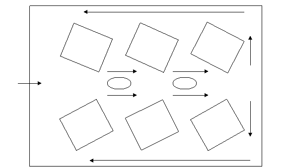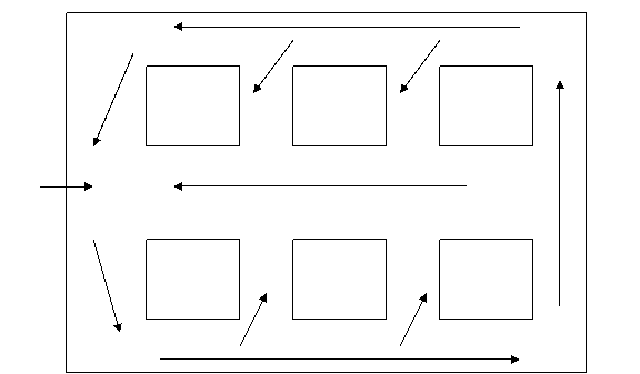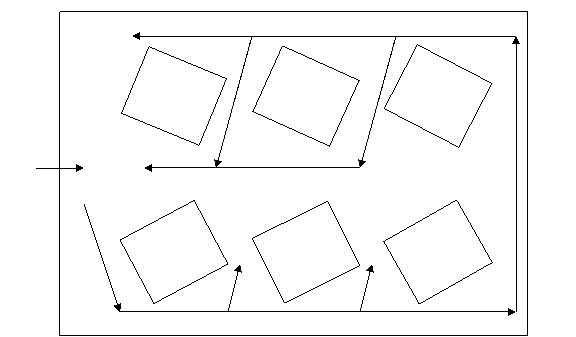 Aceasta amenajare a mobilierului lasa multa libertate clientului, cu conditia sa delimiteze cu precizie diferitele raioane si permite o buna comparare a produselor intre ele. Aceasta amenajare nu-1 asigura pe merchandiser ca totusi clientul urmeaza un circuit perfect definit. Acesta din urma are intr-adevar prea multe posibilitati de a-si alege drumul la fiecare nod de circulatie. In consecinta, exista foarte putine sanse ca el sa vada tot linearul, deci toate produsele din magazin. O astfel de dispunere nu poate sa rentabilizeze in mod armonios suprafata magazinului( fig.1.).
