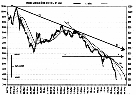 curba cursurilor scade brusc sub cea a mediilor mobile, care prezinta o panta descendenta; in aceasta situatie se poate astepta o revenire a cursurilor catre valoarea mediei mobile.