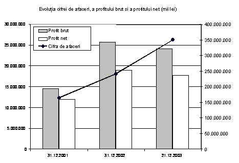 Cifra de afaceri a crescut cu 46,87% in 2002 si cu 44,90% in 2003 fata de 2002. Dinamica profitului brut a fost superioara cifrei de afaceri in 2002 (respectiv 76,48%), dar anul 2003 a consemnat o scadere de 6,48% fata de 2002. Marja bruta a profitului confirma aceasta evolutie, avand valoarea de 8,86% in anul 2001, urmata de o crestere pana la 10,65% in 2002, ca in final sa scada la valoarea de 6,87% in 2003. Conform rezultatelor preliminare prezentate de societate pentru primul semestru al anului 2004, nu se intrevede o imbunatatire a evolutiei, marja bruta a profitului fiind in acest caz de 6,58%. Un comportament asemanator l-a avut si profitul net, care a inregistrat o crestere de 59,25% in 2002, in schimb a scazut cu 6,83% in 2003.
