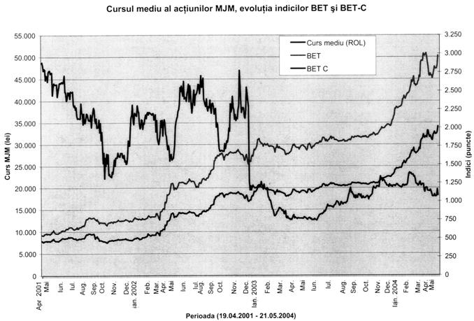 Actiunea are un coeficient beta pozitiv, ceea ce inseamna ca, in cazul unei expansiuni a pietei titlurilor de valoare, cursul actiunii MJM va imprima la randul sau un trend ascendent, iar in cazul unei regresii, cursul actiunii MJM pastra destula energie pentru a nu arata o scadere de proportii (din graficul 1 - se observa ca acestea au urmat trendul general al pietei, cu exceptia primelor luni de tranzactionare - "perioada de acomodare" - si a momentului noii majorari de capital). Acest coeficient a fost calculat pentru ultimul an calendaristic de tranzactionare (21.05.2003 - 21.05.2004).