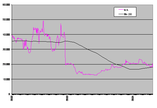 In prima zi de tranzactionare a anului 2003, deschiderea este 19.800 de lei/actiune, iar inchiderea de 500 de lei/actiune (curs mediu 150,00 de lei/actiune). Variatia fata de inceputul anului anterior este de -41,85%, pe cand variatia fata de momentul initial al cotarii la bursa este de -58,57%.