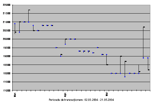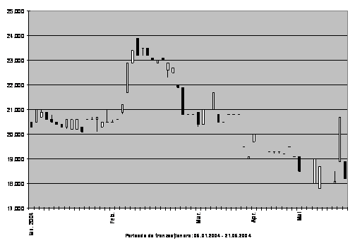 Pentru anul 2004, cursul mediu a inregistrat valorile de 18.311,45 de lei/actiune pentru ultimele zece zile de tranzactionare, 19.469,11 lei/actiune (ultimele 30 de zile) si 435,89 de lei/actiune (ultimele 60 de zile de tranzactionare) indicand un trend descrescator.