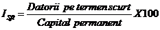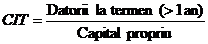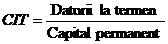 b) Coeficientul de indatorare la termen (CIT) - este raportul dintre datoriile la termen si capitalurile proprii sau capitalul permanent. Se calculeaza in doua variante :