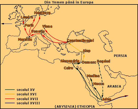 Multe scrieri considera cafeaua originara din regiunea Kaffa Etiopia. De aici, a fost raspandita de catre arabi in Yemen si cultivata. Prima cafea purta numele portului arab la Marea Rosie, Al Mukkan (Mocca). Devine faimoasa datorita faptului ca era singurul loc din lume unde se gasea. Odata cu deschiderea canalului Suez, portul principal pentru peninsula Araba devine Aden. De aici pleaca spre toate zarile.