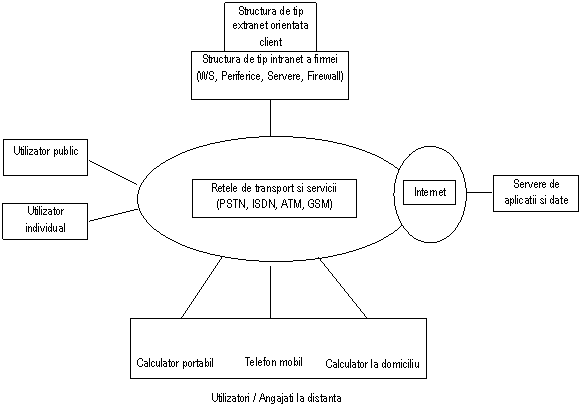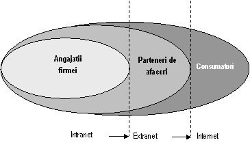 Internetul aduce mult mai aproape compania de clienti si de furnizori. Un site Internet permite o prezenta web pentru publicul general. Un site Intranet utilizeaza tehnologia Internet pentru a oferi angajatilor proprii acces la informatiile interne. Aceste site-uri sunt separate de Internet prin intermediul unor metode de securitate, astfel incat persoanele din afara organizatiei sa nu poata avea acces la informatiile private. Pe un site Extranet, partenerii de afaceri - pe baza unei parole protejate - pot accesa informatii pe care publicul general nu poate (figura nr. 2)