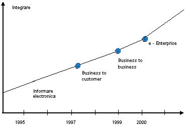 In figura nr. 4 sunt reflectate fazele evolutiei comertului prin intermediul Internetului, cu precizarea ca nu este indicata o data de incepere si de finalizare a unei anumite faze. In fapt aceste etape se suprapun, astfel incat unele companii opereaza in faza de informare electronica iar altele in etapa e-business. Putine firme si-au integrat diferitele faze intr-o forma coerenta astfel incat sa poata trece la faza urmatoare de integrare, respectiv faza de e-Enterprise.