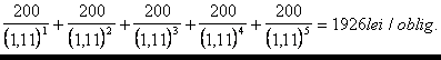 Spre exemplu, un imprumut obligatar, cu o valoare nominala de 2000 lei/obligatiunea si cu o dobanda anuala de 10% (in termeni reali), rambursabila integral dupa 5 ani, poate fi ajustat la conditiile pietei de capital, care a oferit, pentru aceleasi conditii de imprumut, o dobanda de 11 %, astfel :