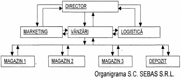 Firma este structurata la ora actuala pe mai multe compartimente. Activitatile desfasurate au dat nastere comparimentelor de vanzari, logistica si cea de marketing, Compatimentui de vanzari are in subordinea lui doua magazine si depozitul en gros din Tandarei, precum si magazinul cu piese auto din Slobozia. Din punct de vedere organizatoric societatea poate fi reprezentata cu ajutorul urmatoarei organigrame: