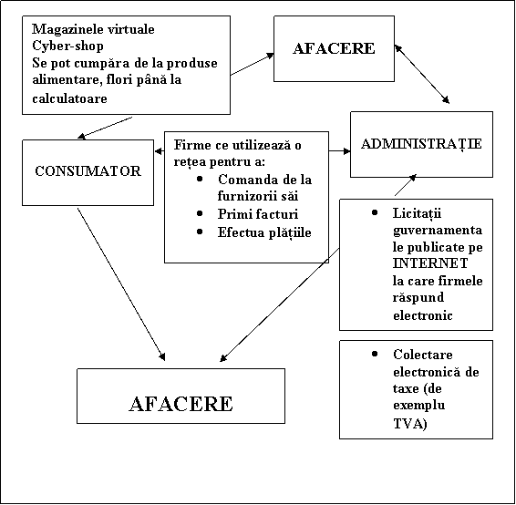 Termenul "afacere electronica" inseamna a face afaceri pe internet, inclusiv cumparari si vanzari de produse si servicii, prestatia serviciilor catre clienti si colaborarea cu parteneri comerciali. In aceasta lucrare se pune accentul pe cumparari si vanzari de produse si servicii pe internet [modul de functionare care este de asemenea cunoscuta sub denumiri precum "comert electronic", "ebiz", "comert on-line", "comert intre intreprinderi (B2B)", "comert electronic cu amanuntul (B2C)"].