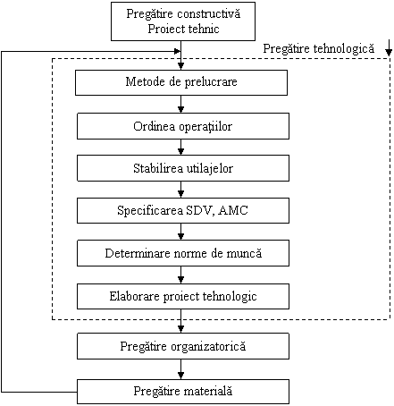Pregatirea tehnologica cuprinde ansamblul activitatilor de elaborare a procesului tehnologic, de proiectare a SDV-urilor speciale si de elaborare a documentatiei tehnologice. Ea este urmata de pregatirea materiala care cuprinde ansamblul de masuri menite sa asigure conditiile necesare realizarii procesului de productie.