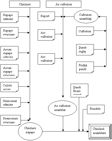schema de asamblare, care indica succesiunea asamblarii pieselor.Cunoscand succesiunea pieselor se evita omiterea unor elemente constructive. Pentru determinarea succesiunii pieselor se foloseste principiul predecesorului ( se stabileste elementul care sa fie inainte). Practica arata ca 30% din timpul pentru pregatirea tehnologica a montajului se consuma cu cunoasterea succesiunii elementelor constructive.(fig. 15);