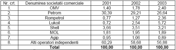 Concurenta pe piata de vanzare cu ridicata de combustibili petrolieri din Romania, in anul 2003, a fost urmatoarea:
