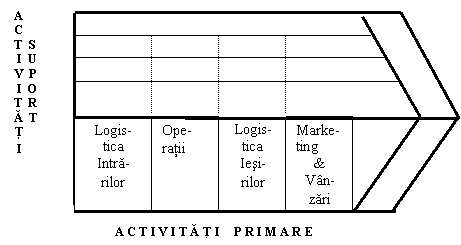 Activitatile - valoare ale firmei se impart in activitati primare si activitati de sprijin (suport). Activitatile primare, evidentiate in jumatatea inferioara a figurii 8.6 sunt cele legate nemijlocit de realizarea produsului sau serviciului si de vanzarea acestuia cumparatorului, inclusiv de satisfacerea nevoilor de asistenta ale acestuia din urma dupa actul vanzarii. Activitatile suport, prezentate in jumatatea superioara a figurii, se sprijina reciproc si asigura intrarile de materiale, tehnologie si forta de munca necesare activitatilor primare; traversarea segmentelor de figura care reprezinta aceste activitati de sprijin de linii punctate semnifica faptul ca activitatile respective pot acoperi cerintele specifice ale unei activitati primare sau pot servi intregul lant. In schimb, segmentul de figura care reprezinta infrastructura firmei, situat in partea cea mai de sus a figurii, nu mai este traversat de linii punctate, intrucat infrastructura nu poate fi asociata unei singure activitati primare, ci serveste toate activitatile primare si de sprijin ale firmei.