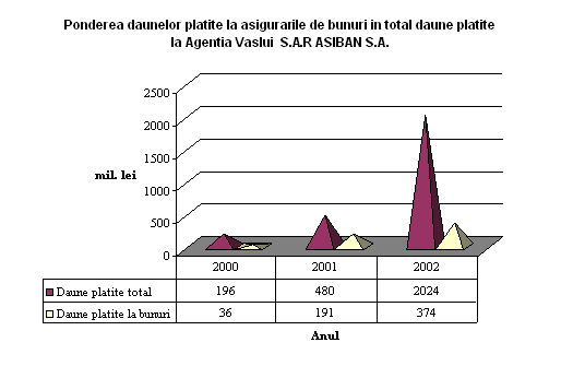 Reprezentarea grafica a daunelor platite pentru asigurarile de bunuri in totalul daunelor platite de agentia Vaslui a S.A.R. ASIBAN S.A. in perioada 2000 - 2002 este prezentata in figura nr. 2.1: