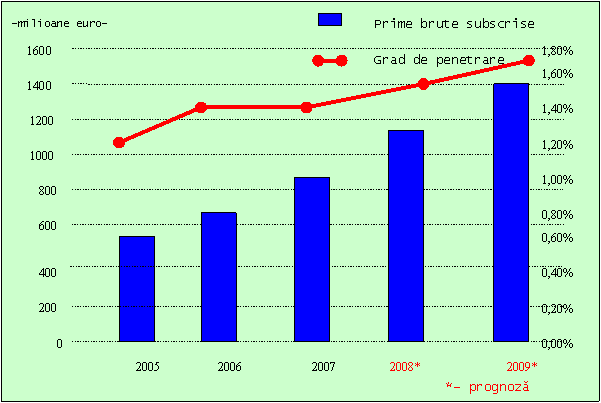 Pe fondul acestor evolutii, se prognozeaza ca piata asigurarilor va consemna in 2008 si 2009 cresteri anuale de peste 20%, in euro, cu o dinamica mai buna a asigurarilor de viata (graficul nr. 1).