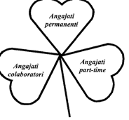 Trifoiul organizational imaginat de Charles Handy are trei frunze, cate o frunza pentru fiecare forma de incadrare a angajatilor. Pe una din frunze sunt reprezentati de angajatii de baza sau permanenti. Angajatii permanenti urmeaza o cariera profesionala traditionala. Dezvoltandu-si anumite abilitati profesionale de importanta critica pentru activitatea firmei, acesti angajati pot avansa si pot ramane in cadrul firmei o perioada e timp indelungata. Pe cea de a doua frunza a trifoiului organizational sunt reprezentati angajatii pe baza de contracte de colaborare. Ei desfasoara o anumita activitate necesara organizatiei si sunt recompensati prin acord sau comision si nu pe baza de salariu fix. Angajatii colaboratori presteaza un anumit serviciu angajatorilor lor, putand lucra in beneficiul mai multor angajatori. Pe cea de a treia frunza sunt reprezentati angajatii part-time sau cu program de lucru partial. Ei sunt angajati temporar sau pentru un anumit numar de ore. In functie de evolutia activitatii firmei numarul de angajati temporari poate sa creasca sau sa scada.