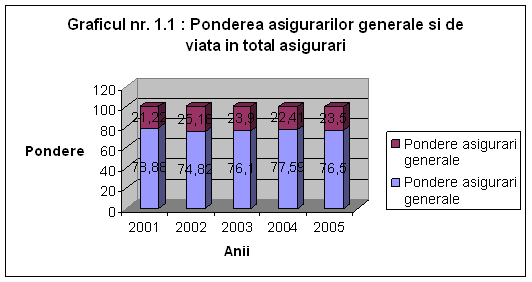 Grafic, evolutia ponderii asigurarilor generale si de viata in perioada 2001-2005, se prezinta astfel (Graficul nr.1.1):