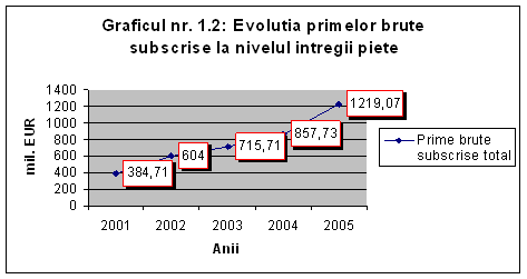 Evolutia primelor brute subscrise la nivelul intregii piete (mil. EUR), in perioada 2001-2005 se prezinta dupa cum urmeaza (Graficul nr. 1.2.):