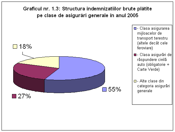 Trecand la analiza pe clase de asigurari, observam ca 55,3 % din totalul indemnizatiilor platite a avut loc la clasa asigurarea mijloacelor de transport terestru (altele decat cele feroviare), ceea ce inseamna ca la aceasta clasa se inregistreaza cea mai inalta rata a daunalitatii. Urmeaza in ordine cu o pondere de 26,6 %, clasa asigurarii de raspundere civila auto, cu cele doua componente, respectiv asigurarea obligatorie si asigurarea "Carte Verde". Grafic, indemnizatiile brute platite pe clase de asigurari generale la nivelul anului 2005, se prezinta astfel (Graficul nr. 1.3):