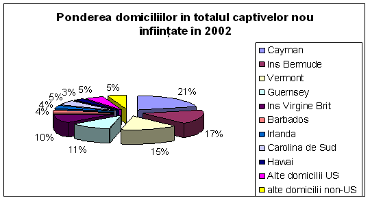 Daca luam in considerare statisticile A.M.Best care includ in randul societatilor captive de asigurari si celulele protectoare ,societatile rent a captive la sfarsitul anului 2002 existau un numar de 4.526 de societati captive in activitate.Din totalul de 462 de societati nou infiintate cele mai multe s-au inregistrat in Cayman-21%,Ins.Bermude-17% si Vermont 15% .Grafic situatia se prezinta in felul urmator: