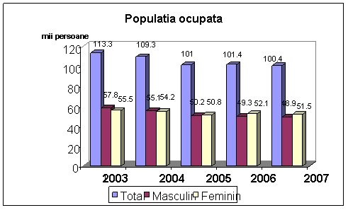 Populatia ocupata a inregistrat aceeasi tendinta de scadere, aceasta fiind la sfarsitul anului 2007 de 100,4 mii persoane. Rata de ocupare globala era de 31,55, cea a populatiei de 15 ani si peste , de 37,8%, iar a populatiei in varsta de munca intre 15 -64 ani de 47,4%. Evolutia populatiei ocupate este urmatoarea: