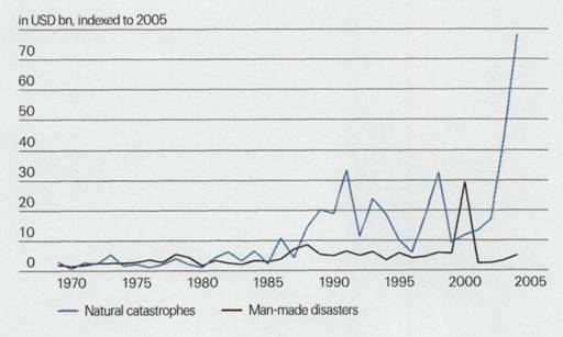 Fig. 1.1. Pierderi asigurate datorate catastrofelor naturale si tehnice in perioada 1970-2005