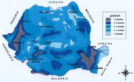Figura 1.3. Zonarea mediei celor mai mari cinci valori ale intensitatii pluviale (1961-2000)