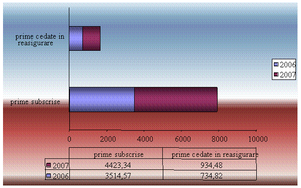 Primele totale subscrise in anul 2006 au fost de 514,57 milioane RON si au crescut la 4.423,34 milioane RON, ceea ce inseamna o crestere de 25,85 %. Valoarea primelor cedate in reasigurare pentru anul 2007 este in suma de 934,48 milioane RON si a inregistrat o crestere de 27,16% fata de anul 2006.
