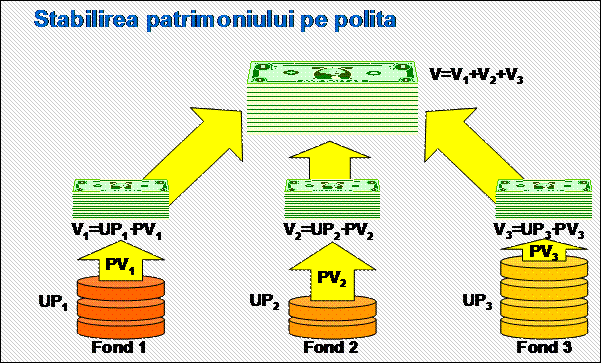 Elemente care contribuie la stabilirea patrimoniului. Valoarea patrimoniului pe polita la o anumita data se stabileste pe baza numarului de unitati de patrimoniu la fiecare fond de investitii pe contul de investitii alocat si pe baza valorii de vanzare a unitatii de patrimoniu, care este valabila la acea data.