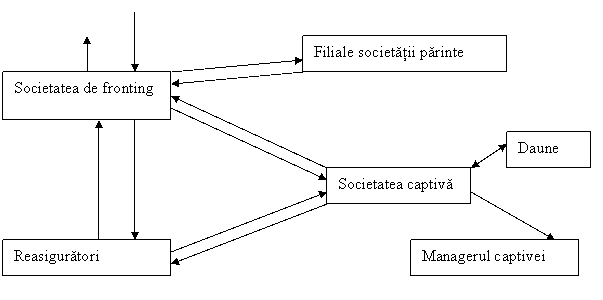 Legenda:fluxurile descendente continue reprezinta prime platite,fluxurile ascendente continue reprezinta despagubiri platite ,fluxul continuu in dublu sens reprezinta finantarea daunelor de catre societatea captiva,fluxul descendent discontinuu reprezinta taxele de management.