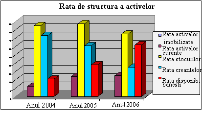 In ceea ce priveste structura activelor, in perioada analizata se constata o crestere a gradului de imobilizare a activelor. Astfel, ponderea activelor imobilizate in total active a crescut de la 11.88% in anul 2004, la 23.93% in anul 2005 si respectiv la 24.45% in anul 2006. Rata activelor curente variaza de la 86.55% in 2005 pana la 75.32% in anul 2006.