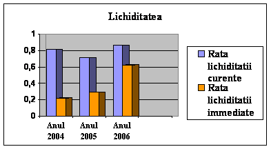 Lichiditatea curenta a firmei este in scadere in anul 2005 fata de 2004, dar in urcare cu doar cateva procente in anul 2006 ajungand la 0.86%. Acest indicator are valori subunitare in perioada analizata, iar in corelatie cu volumul ridicat al stocurilor, duce la inregistrarea unui nivel necorespunzator al lichiditatii imediate. Astfel, in perioada celor 3 ani analizati intreprinderea nu poate face fata datoriilor scadente decat intr-o proportie foarte redusa.