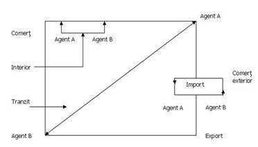 . Tranzitul, care surprinde un proces economic in cadrul caruia marfurile nu fac altceva decat sa traverseze tara. in acest caz, este de remarcat faptul ca aceeasi partida de marfa poate forma obiectul tranzitului pentru mai multe tari (de exemplu, un lot de marfa contractat de catre un importator roman din Germania poate forma obiectul tranzitului, atat pentru Austria, cat si pentru Ungaria). Schematic, structura comertului prezentata mai sus este redata in figura 1.2