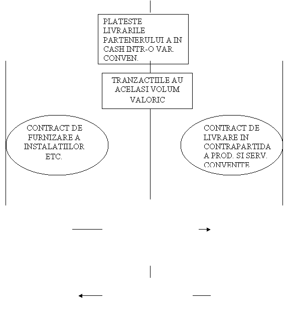 Cea de-a doua modalitate ;varianta scoate in evidenta ca finantarea si plata au loc separat, calculul facandu-se intr-o valuta convenita pentru cele doua tranzactii, livrare de utilaje si prelucrare de produse realizate cu aceste utilaje sau orice alte produse acceptate de parteneri. In aceasta modalitate se incheie contracte separate. Aceasta varianta implica negocierea si incheierea unor contracte pentru fiecare faza a actiunii asa cum rezulta din schema nr.3.