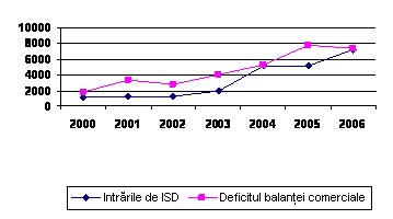 Figura nr. 3 Evolutia intrarilor de ISD si a deficitului balantei comerciale in Romania (mil.euro)