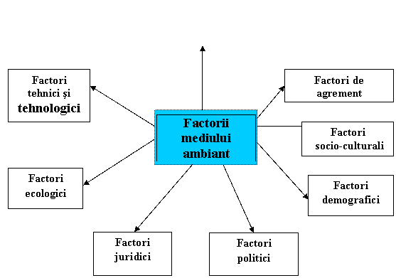 Factori externi (economici, sociali si tehnici) sunt sensul si ritmul de dezvoltare a ramurii sau domeniului de activitate, informatiile cu privire la valorificare cercetarii tehnice, economice si sociale, restrictiile cu caracter functional, de structura, de dim,ensiune si cele cu caracter normativ legislativ, cadrul de relatii reprezentat de ansamblul controlat al relatiilor cu alte organisme.[3]