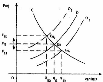 Eq,Eq1,Eq2-punctele de echilibru, initial, modificat prin cresterea ofertei si scaderea ofertei;