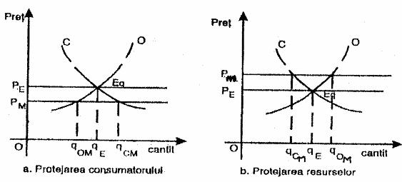 Aceasta cantitate qCm corespunde punctului de intersectie a dreptei pretului minim cu curba cererii. Oferta, in schimb, va creste de la qE la qOm,care reprezinta cantitatea ce corespunde punctului de intersectie a dreptei pretului minim cu curba ofertei. In acest caz apare un excedent de oferta fata de cerere, a carui marime este data de diferenta qOm-qCm. In asemenea situatii statul trebuie sa adopte si alte masuri prin care sa asigure conditii de desfacere a surplusului de oferta, fie prin achizitii proprii, fie prin acordarea unor facilitati fiscale sau de credit producatorilor ori cumparatorilor ori prin stimularea exporturilor etc. Existenta unui exces de oferta insa va pune producatorii in situatia de a acorda ei anumite facilitati (rabaturi) cumparatorilor pentru a-si spori volumul vanzarilor, ceea ce face ca incasarea efectiva (pretul minim mai putin aceste rabaturi acordate) sa tinda catre pretul de echilibru.