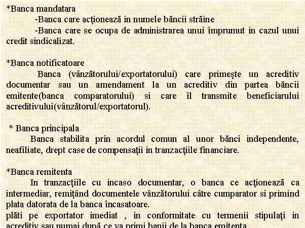 Aceasta primeste documentele(actele necesare pentru incasarea banilor) de la vanzator pentru a le inainta (remite) bancii comparatorului (banca incasatoare/ de prezentare), o data cu instructiunile de plata.