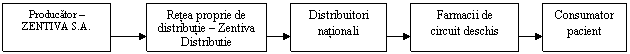Zentiva Distributie, reteaua proprie a producatorului Zentiva S.A., vinde, asa cum am spus si mai sus, direct farmaciilor, care pot fi farmacii de circuit deschis, adica toate farmaciile care deservesc populatia in mod direct si farmacii de circuit inchis, acestea fiind reprezentate in special de cabinete medicale si farmaciile unitatilor spitalicesti. Principali intermediari ai S.C. Zentiva fiind: propria retea de distributie formata din depozite situate in cele mai importante orase din Romania : Bucuresti, Cluj Napoca, Galati, Constanta, Craiova, Iasi, Brasov si Timisoara cat si principali distribuitori nationali si regionali. Firma fiind in cautare de noi canale de distributie si gasirea de noi puncte de vanzare.