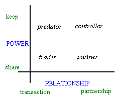Clasicul tip, cel al comerciantului este caracterizat de un nivel mic atat al puterii, cat si al relatiilor, in timp ce tipul pradator este cel care pune accent pe putere, lasind pe planul secund relatiile.