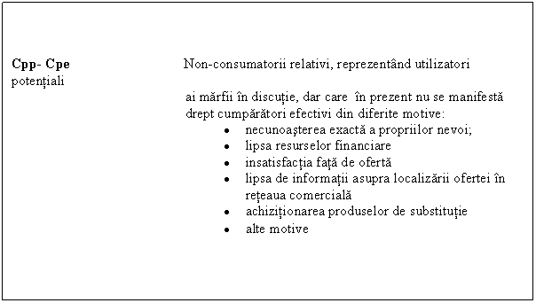 o efectivul si structura non-consumatorilor relativi privesc numarul si principalele caracteristici ale potentialelor clienti ai unei intreprinderi dintr-o tara a marfii in cauza.
