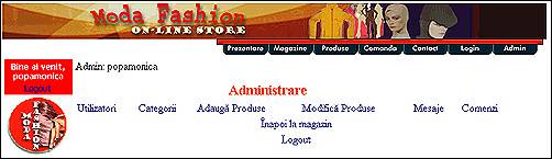 2. Sectiunea de administrare este accesibila administratorului magazinului virtual, care poate fi un angajat cu acces la produsele magazinului, nu neaparat programatorul magazinului. Un administrator are acces la toate paginile magazinului, in plus el putand adauga sau modifica produse, vizualiza comenzi si formulare de contact ale utilizatorilor, modifica date, niveluri de acces ale utilizatorilor ori stergere utilizatori, raspunde la mesaje sau stergerea lor, prelucrare comenzi sau stergere manuala a acestora in cazul in care nu sunt confirmate. De asemenea, un administrator nu are acces la parola unui utilizator, el neputandu-se loga ca si client folosind numele si parola acestuia. Este o procedura normala in e-commerce, toate parolele fiind stocate criptat in baza de date, dandu-i clientului impresia de siguranta. Oricum, un administrator are acces la intreaga baza de date, putand manipula informatia dupa dorinta.