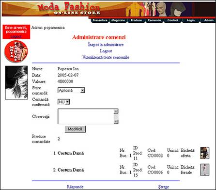 comenzi - se pot vizualiza comenzile, detaliat, se poate vedea starea lor, daca o comanda este validata de client sau nu, se poate modifica starea onorarii sale, se poate raspunde clientului punctual, sau pur si simplu se poate sterge aceasta comanda: