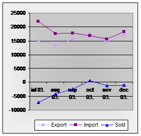 In 2002, semestrul al doilea balanta comerciala a fost deficitara(-501 mii Euro), pastrandu-si trendul negativ si in aceeasi perioada a lui 2003 cand aceasta a fost cronic deficitara(-15711 mii Euro).