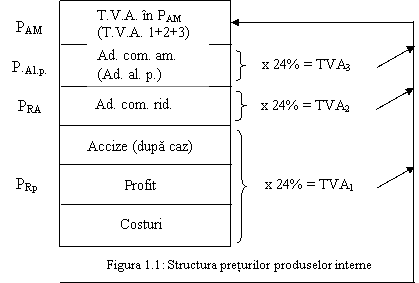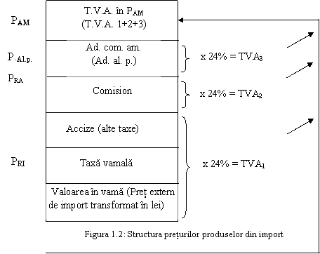 In ceea ce priveste preturile cu ridicata ale produselor provenite din import (PPI), acestea sunt formate din: valoarea in vama (rezultata prin transformarea in lei, la cursul de schimb in vigoare, a pretului extern, in conditiile de livrare franco-frontiera romana), taxa vamala, alte taxe si accize datorate, dupa caz. La aceste preturi se calculeaza, de regula, un comision cuvenit unitatii importatoare. Formarea celorlalte preturi (cu ridicata, cu amanuntul sau de alimentatie publica) pentru produsele importate este similara formarii preturilor interne in functie de natura bunurilor si circuitului lor. Pentru a inlesni intelegerea modului de formare a preturilor, se prezinta structura preturilor produselor interne si a preturilor produselor din import (figura 1.1 si 1.2).
