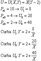 Punctul E1 de coordonate (2, 6) din fig. 10. indica combinatia optima (2 unitati din bunul X si 6 unitati din bunul Y) sau punctul de echilibru al consumatorului, intrucat, cu venitul sau de 50 u.m. el atinge curba de indiferenta cea mai ridicata posibil, care‑i asigura o utilitate de: U=X(Y-2)=2(6-2)=8. Deci, curba de indiferenta U1 din fig. 10 este definita de functia: